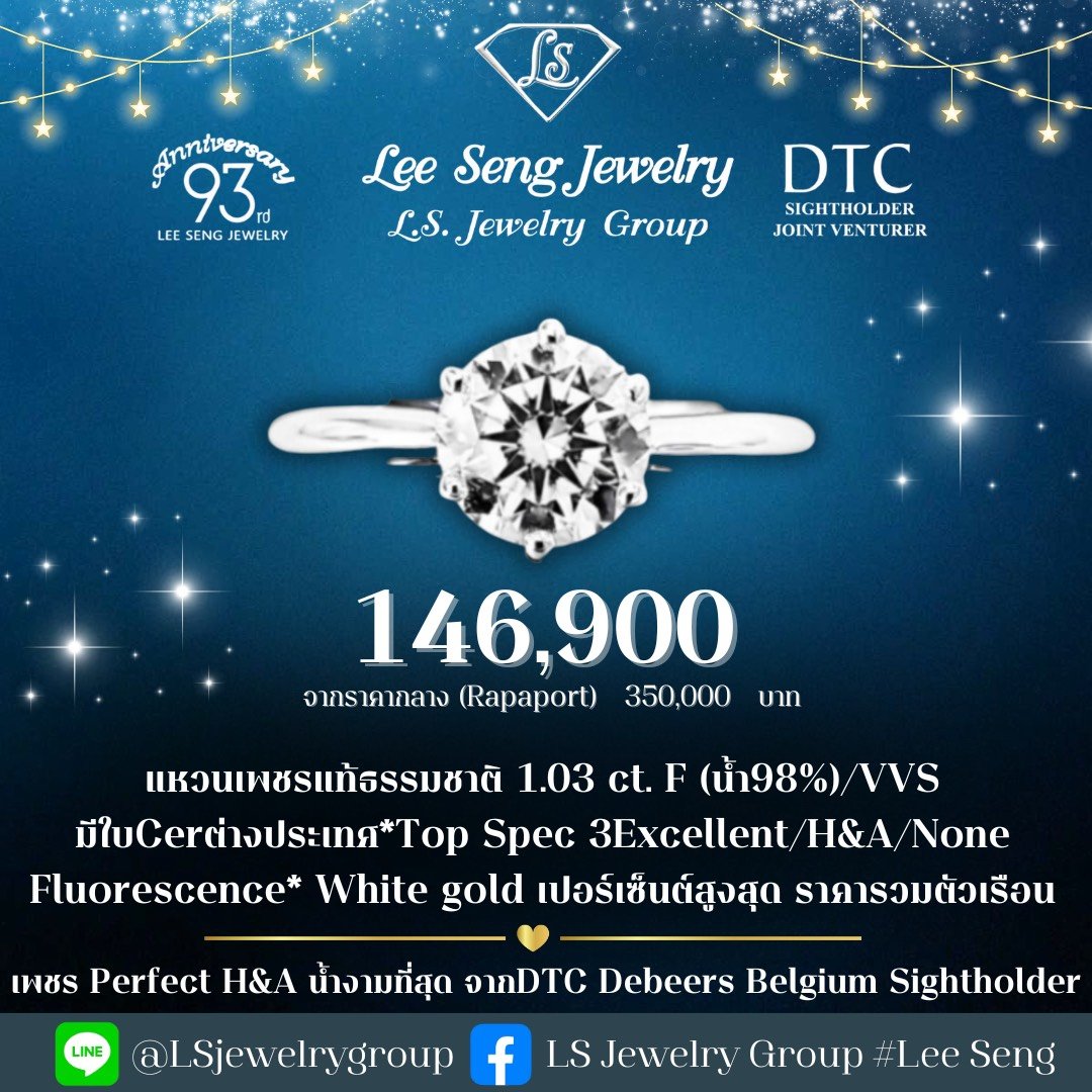 เพชรกลาง 1.03 Ct. มีใบ Cer F color (น้ำ 99%)/VVS 3Excellent/Heart&Arrow/None Fluorescence (พร้อมใบเซอร์แลปต่างประเทศ) เพชรบ่า 0.10 Ct. 14 เม็ด (น้ำ 100-99%)