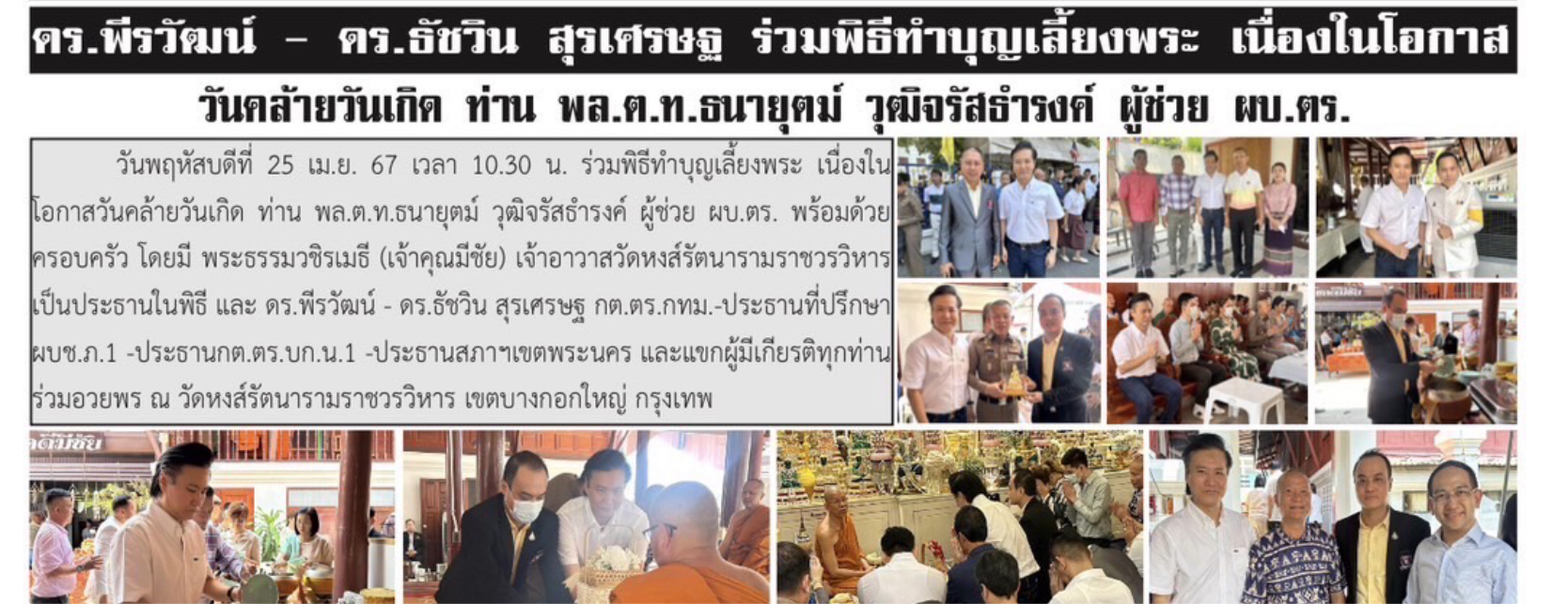 ท่านพล.ต.ท.ธนายุตม์ วุฒิจรัสธำรง ผู้ช่วยผบ.ตร. ต้อนรับ ดร.พีรวัฒน์-ดร.ธัชวิน สุรเศรษฐ กต.ตร.กทม.(ผู้ทรงคุณวุฒิด้านความมั่นคง)-ประธานกต.ตร.บก.น.1-ประธานสภาฯเขตพระนคร ร่วมพิธีทำบุญเลี้ยงพระ เนื่องในโอกาสวันคล้ายวันเกิด พร้อมแขกผู้มีเกียรติ ณ วัดหงส์รัตนารามฯ