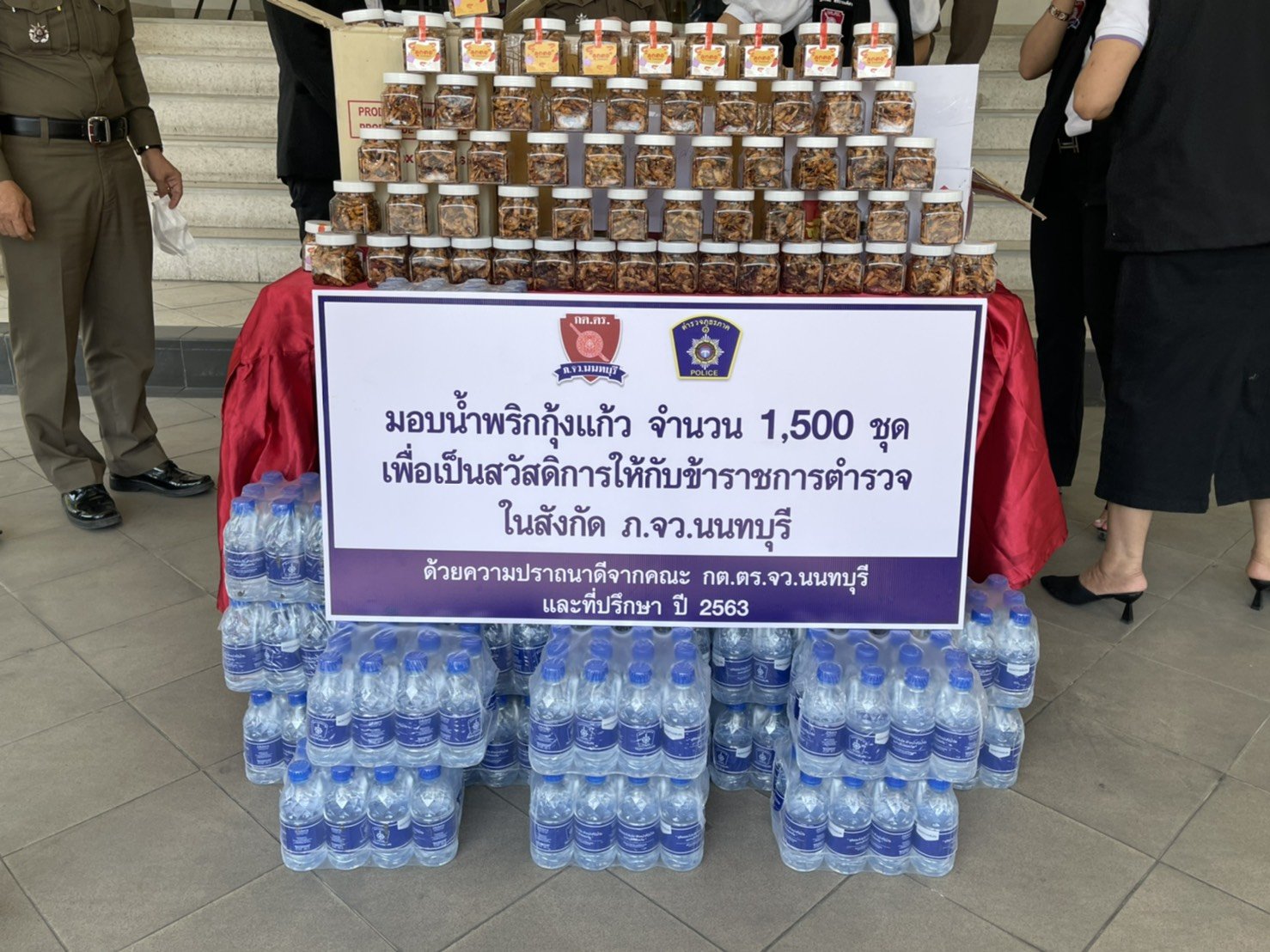 ท่านพล.ต.ต. ไพศาล วงศ์วัชรมงคล ผู้บังคับการตำรวจภูธรจังหวัดนนทบุรี พร้อมด้วย ดร.พีรวัฒน์ สุรเศรษฐ ประธานกต.ตร.กทม.(ภาคประชาชน), ดร. ชัยรัตน์ จำนงค์การ ประธานกต.ตร.ภ.จว.นนทบุรี(ภาคประชาขน), คุณ ศศพักษณ์ ศิริสินโอฬาร คณะกต.ตร.นนทบุรีและที่ปรึกษา ร่วมมอบน้ำพริกกุ้งแก้ว จำนวน 1500 ชุด เพื่อเป็นสวัสดิการให้กับข้าราชการตำรวจในสังกัด ภ.จว.นนทบุรี ณ ภ.จว.นนทบุรี วันพุธที่ 3 ก.พ. 64