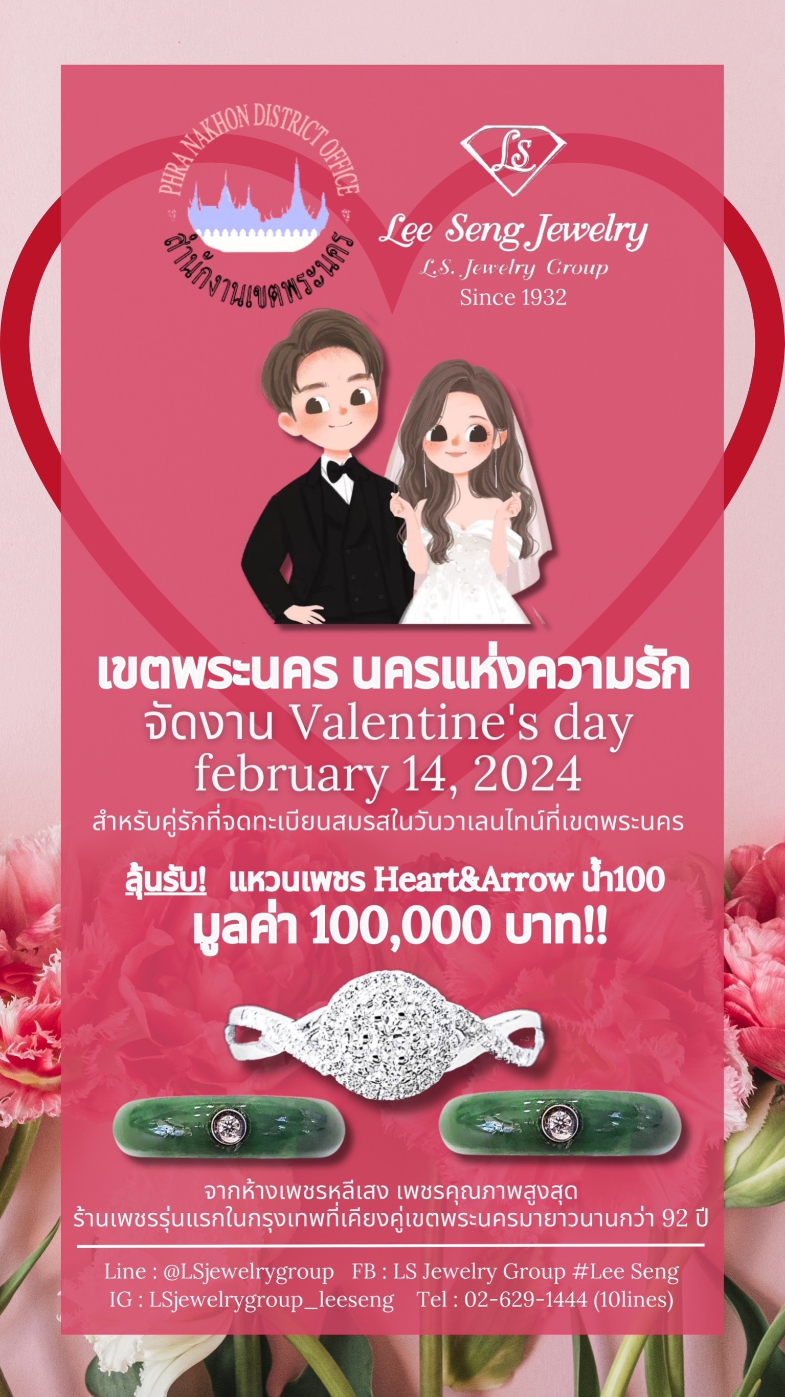 ห้างเพชรหลีเสง (L.S.Jewelry Group) โดย ดร.นฤมล-ดร.พีรวัฒน์-ดร.ธัชวิน สุรเศรษฐ ประธานสภาฯ เขตพระนคร-กต.ตร.กทม.(ผู้ทรงคุณวุฒิด้านความมั่นคง)-ประธานกต.ตร.บก.น.1-ประธานกต.ตร.สน.ชนะสงคราม มอบแหวนเพชรแท้ธรรมชาติ Heart&Arrow น้ำงามที่สุด จำนวน 3 วง มูลค่า 100,000 บาท ให้แก่คู่รักผู้โชคดีที่จดทะเบียนสมรส ในวันวาเลนไทน์ 14 กุมภาพันธ์ 2567 ที่สำนักงานเขตพระนคร ซึ่งจัดโดย ผอ.โกศล สิงหนาท ผู้อำนวยการเขตพระนคร ในงานวันวาเลนไทน์ “เขตพระนคร นครแห่งความรัก” ณ สำนักงานเขตพระนคร วันพุธที่ 14 ก.พ. 67