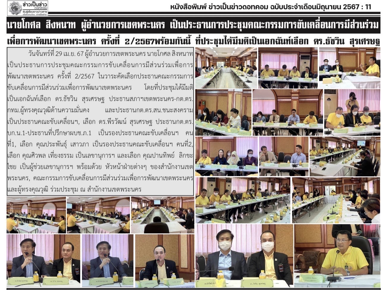 ผอ.เขตพระนคร คุณโกศล สิงหนาท เป็นประธานการประชุมคณะกรรมการขับเคลื่อนการมีส่วนร่วมเพื่อการพัฒนาเขตพระนคร ครั้งที่ 2/2567 ในวาระคัดเลือกประธานคณะกรรมการขับเคลื่อนการมีส่วนร่วมเพื่อการพัฒนาเขตพระนคร โดยที่ประชุมได้มีมติเป็นเอกฉันท์เลือก ดร.ธัชวิน สุรเศรษฐ เป็นประธานฯ, เลือก ดร.พีรวัฒน์ สุรเศรษฐ และ คุณประพันธุ์ เสาวภา เป็นรองประธานฯ พร้อมคณะกรรมการฯ ร่วมประชุม ณ สำนักงานเขตพระนคร